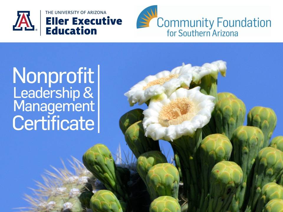 Nonprofit professionals are eligible to receive a Nonprofit Leadership & Management Certificate from Eller Executive Education if they complete three of the eight provided modules. This certificate program is provided free of charge to local nonprofits, thanks to community support provided by local individuals and organizations through the Community Foundation for Southern Arizona.